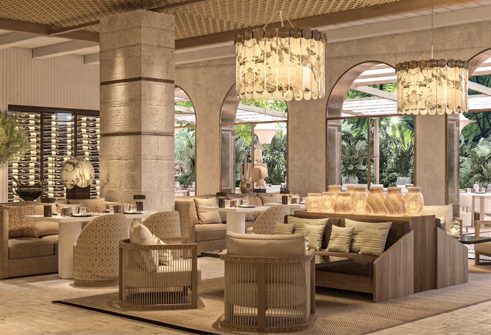 Natural Mediterranean materials like plaster, travertine, and coral stone harmonize with handcrafted ceramics, woven rattan, and oak millwork. A sun-washed palette of whites and earth tones sets the stage for sculptural arches, bespoke lighting, and a glowing rainforest marble bar that evokes a Greek sunset. Commissioned artworks, including silk tapestries and handcrafted stuccos, turn the interiors into a living gallery.